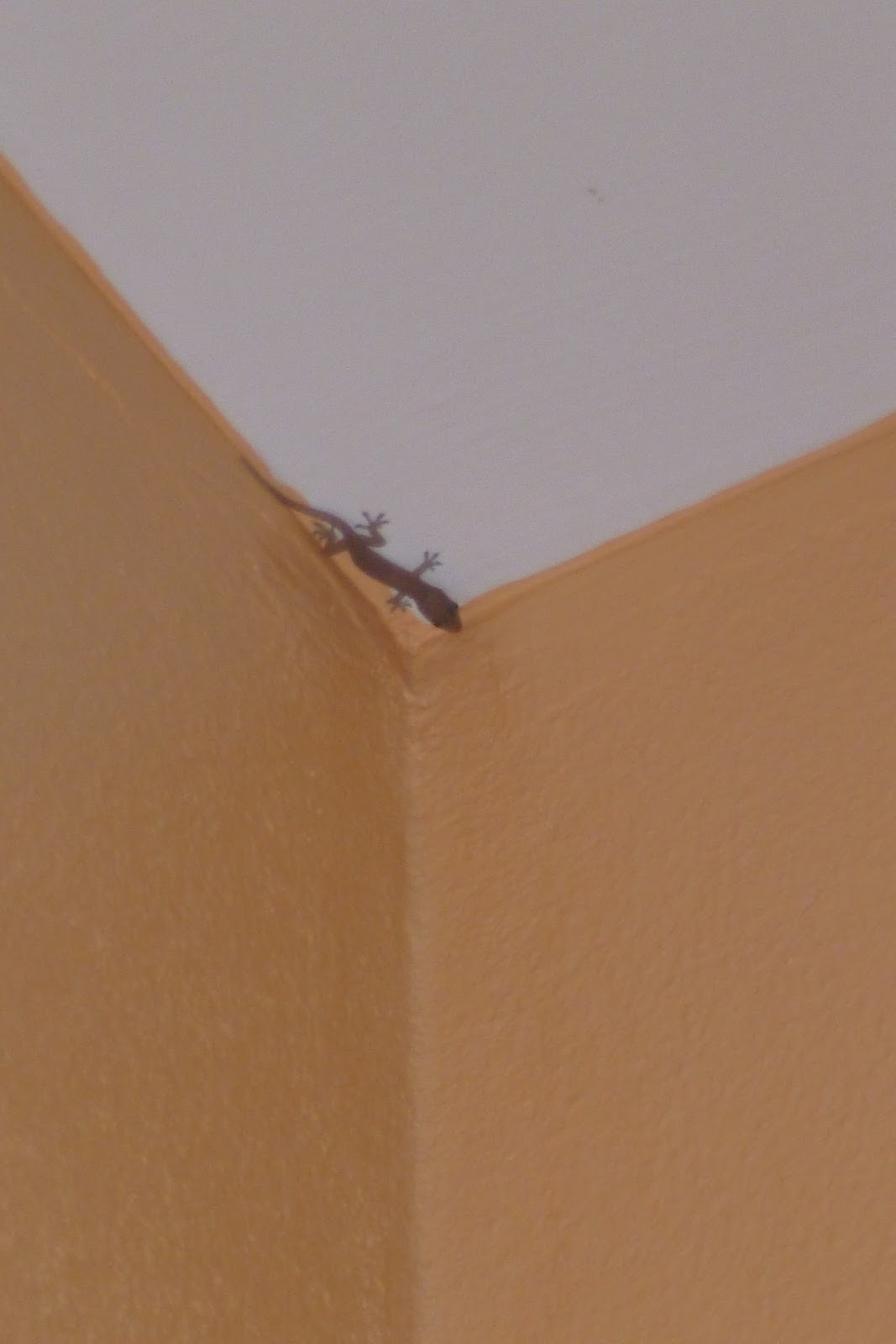 Im und am Haus leben natürlich noch einige Geckos. Ich hatte glaub schon erwähnt das ich diese Tiere eigentlich sehr schätze weil sie Moskitos fressen, einem allerdings leider auch die Wohnung vollmachen…Nichtsdestotrotz find ich sie echt putzig, vor allem diesen kleinen „Baby-Gecko“ der höchstens 2,5 cm lang ist (hier natürlich groß gezoomt, hing kopfüber an der Decke):